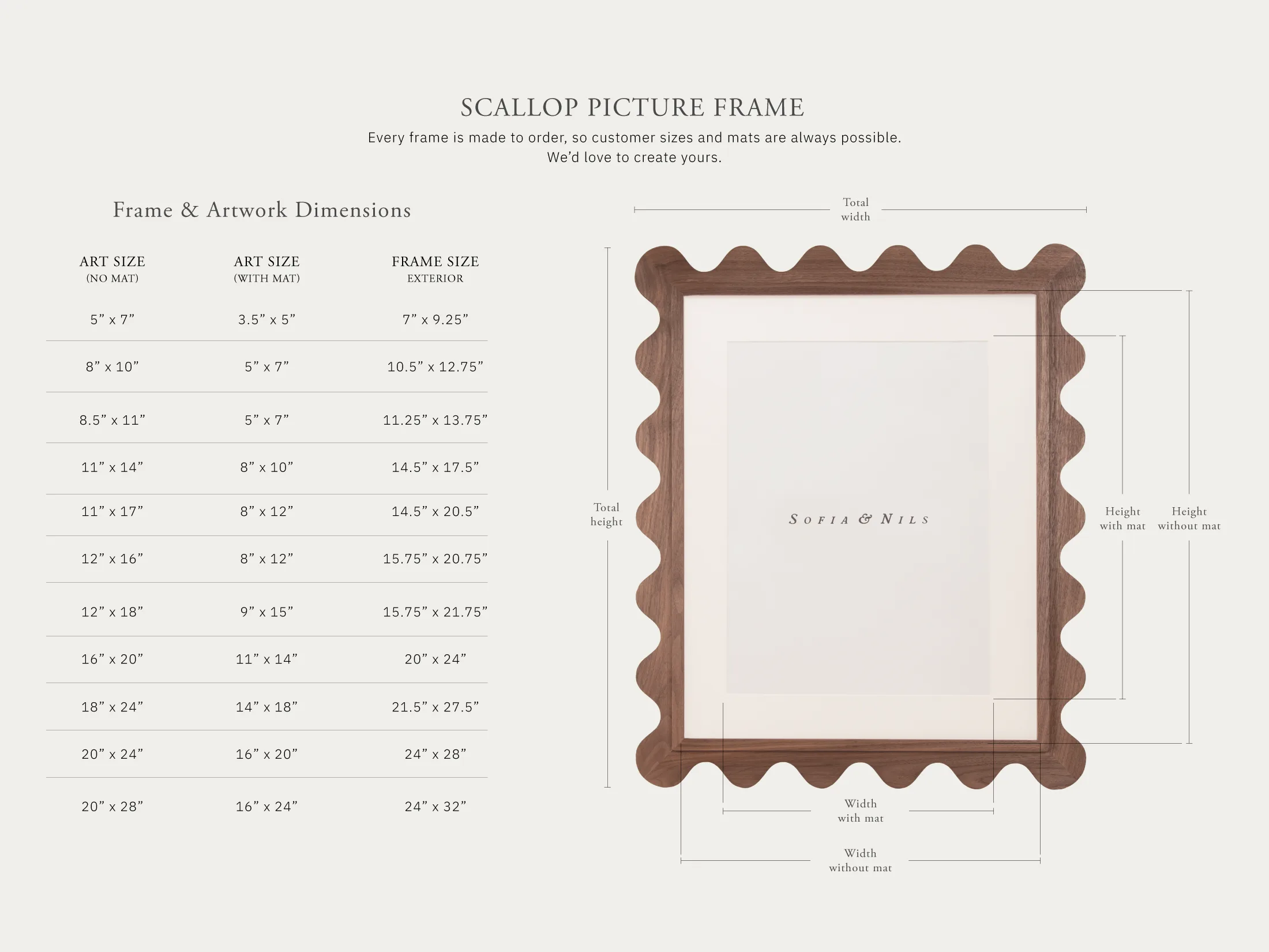 Inspired by the simplicity and charm of Scandinavian folk art, the Elise Scallop Frame features wavy lines that create a distinctive, textural profile. The scallop design adds a touch of whimsy and sophistication promising to showcase your most treasured art with warmth and character.